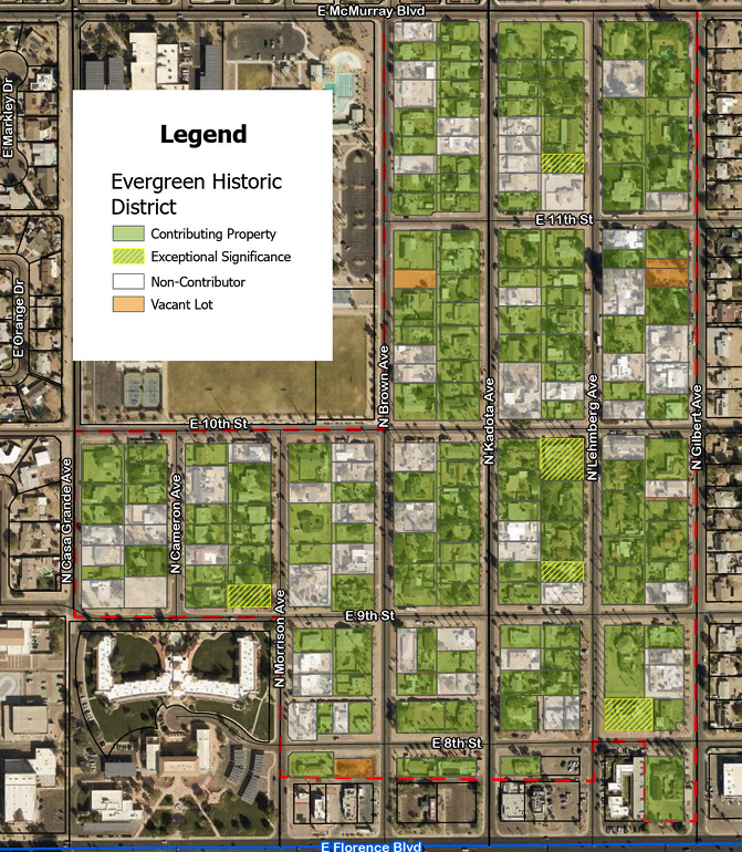 The Evergreen Addition Historic District was officially listed on the National Register of Historic Places on January 22, 2009. This special designation recognizes Evergreen's importance to Casa Grande’s history, showcasing beautiful architecture from the 1920s through the 1950s. From Craftsman bungalows to classic Ranch homes, the Evergreen District tells the story of our city's early days of growth and community spirit.