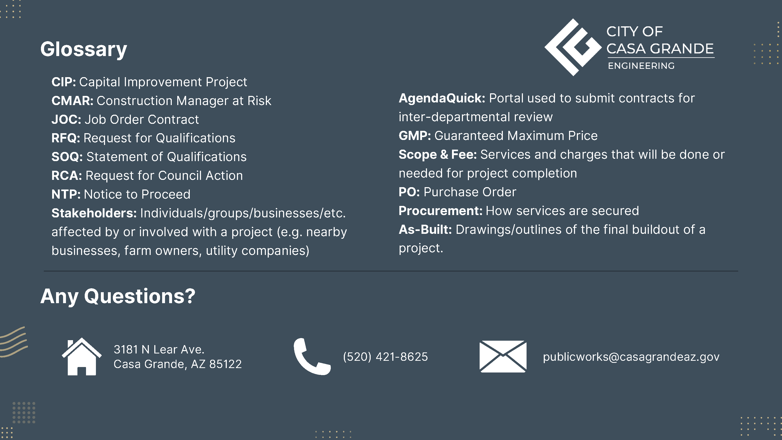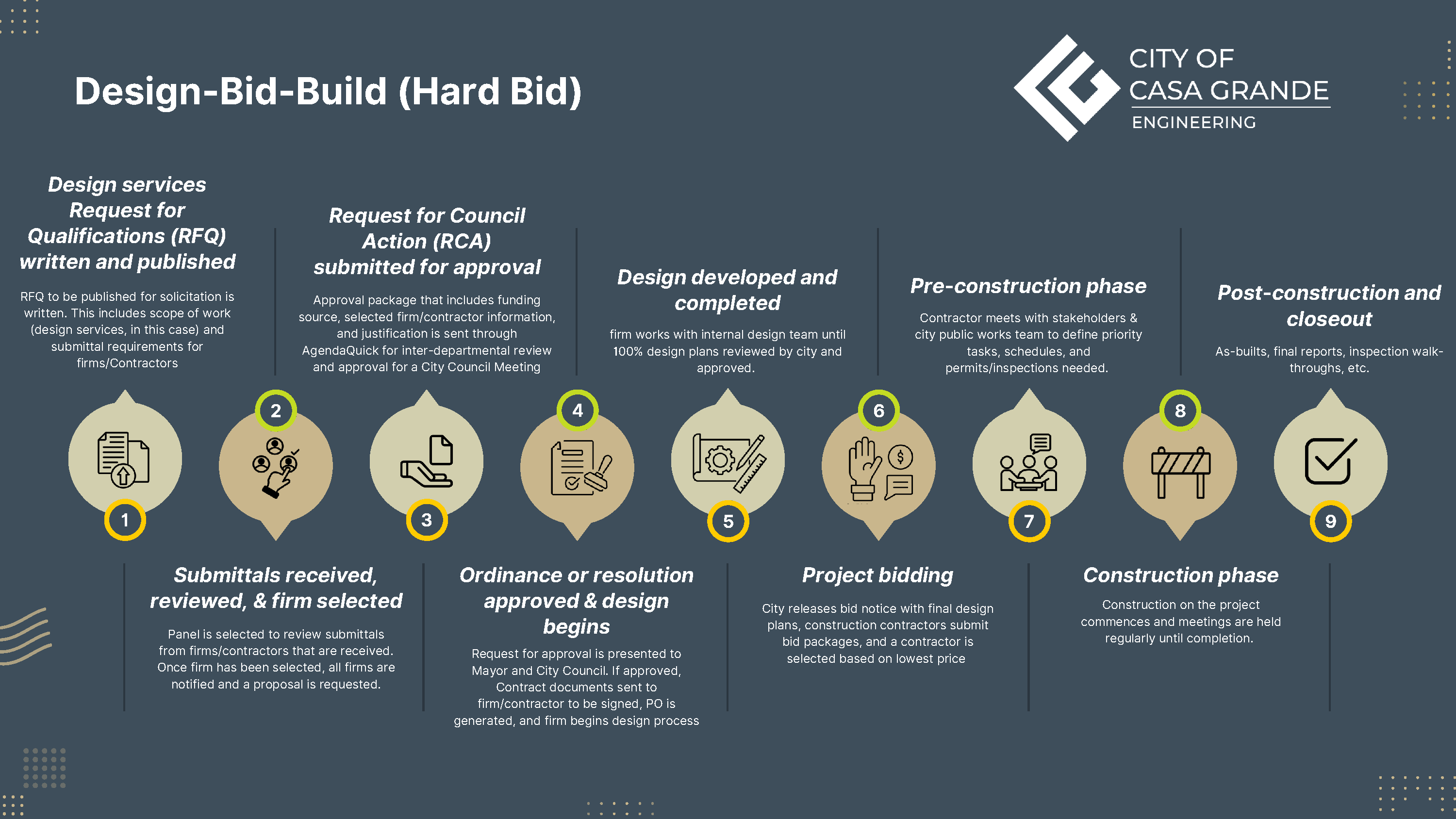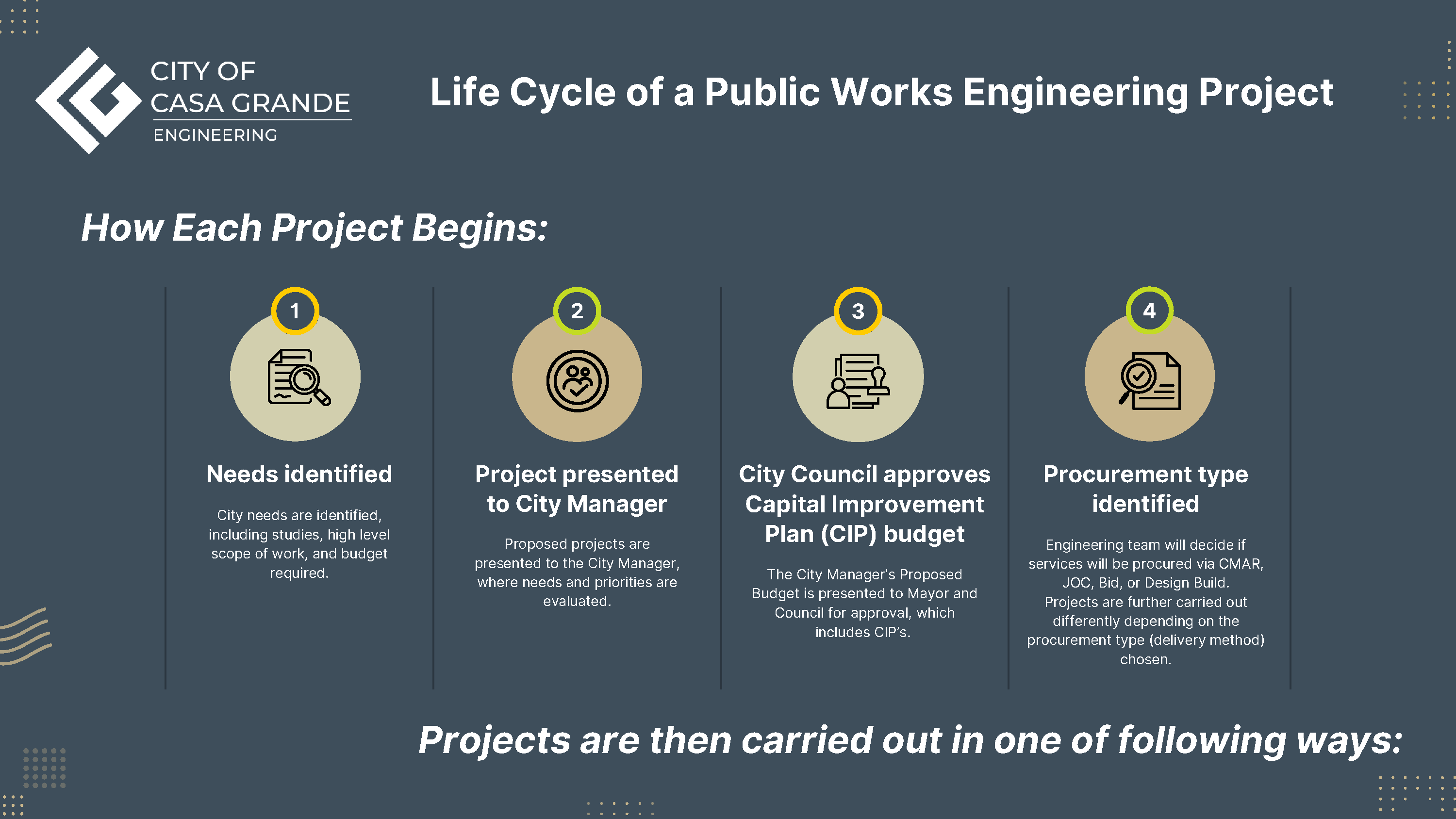 The City of Casa Grande's Public Works Projects follow a structured process to ensure that community needs are met effectively. Projects begin with identifying priorities and funding through the City’s Capital Improvement Plan (CIP). Once approved by City Council, projects move forward using one of several delivery methods, such as Construction Manager at Risk (CMAR), Design-Bid-Build, or Design-Build.