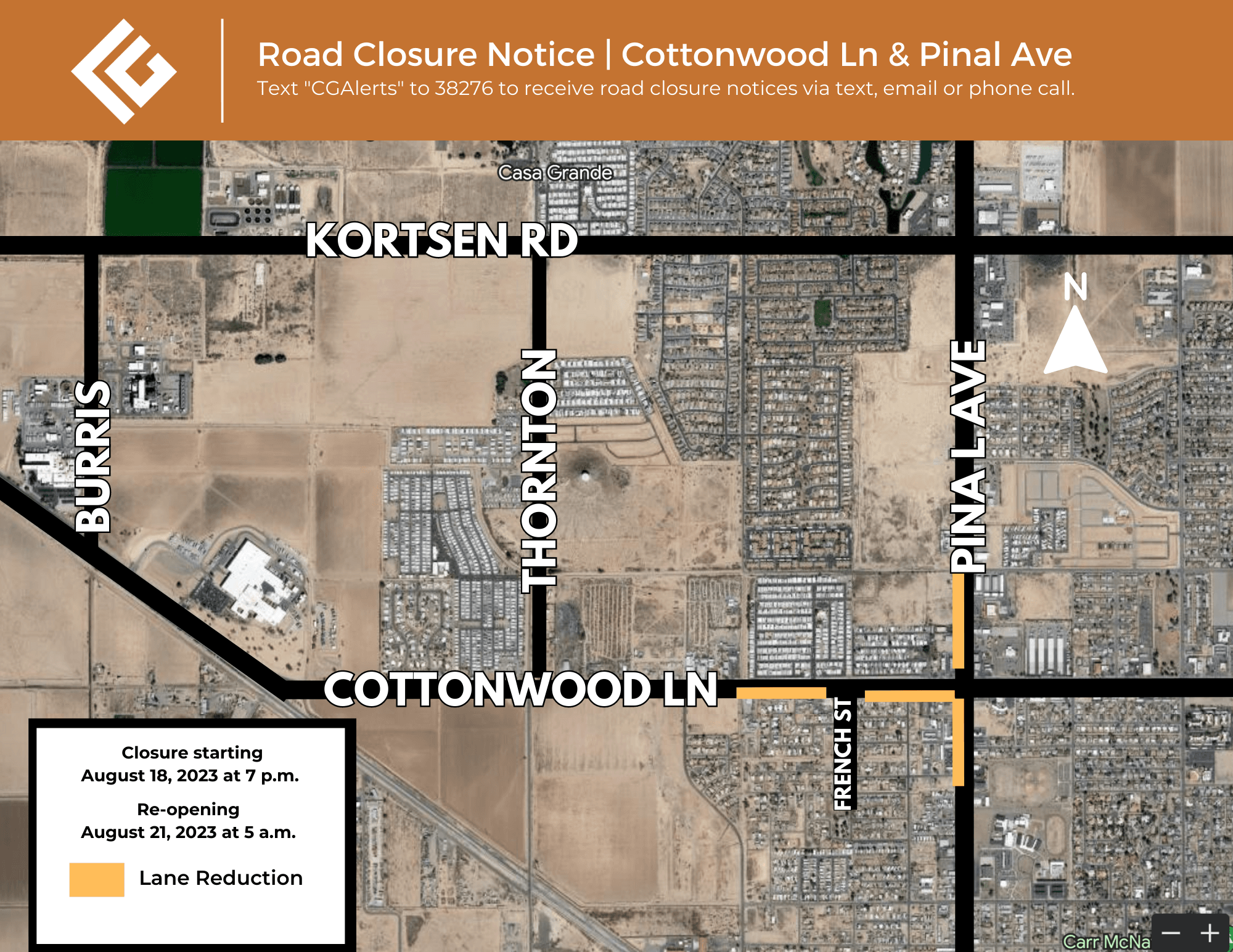 Casa Grande, AZ (August 17, 2023) – Beginning at 7 p.m. on Friday, August 18th and lasting until approximately 5 a.m. on Monday, August 21st, Cottonwood Lane westbound, and north and southbound Pinal Avenue will experience lane reductions for a pavement repair project. This is the second phase of the Arizona Water Company’s waterline replacement project that began last weekend.