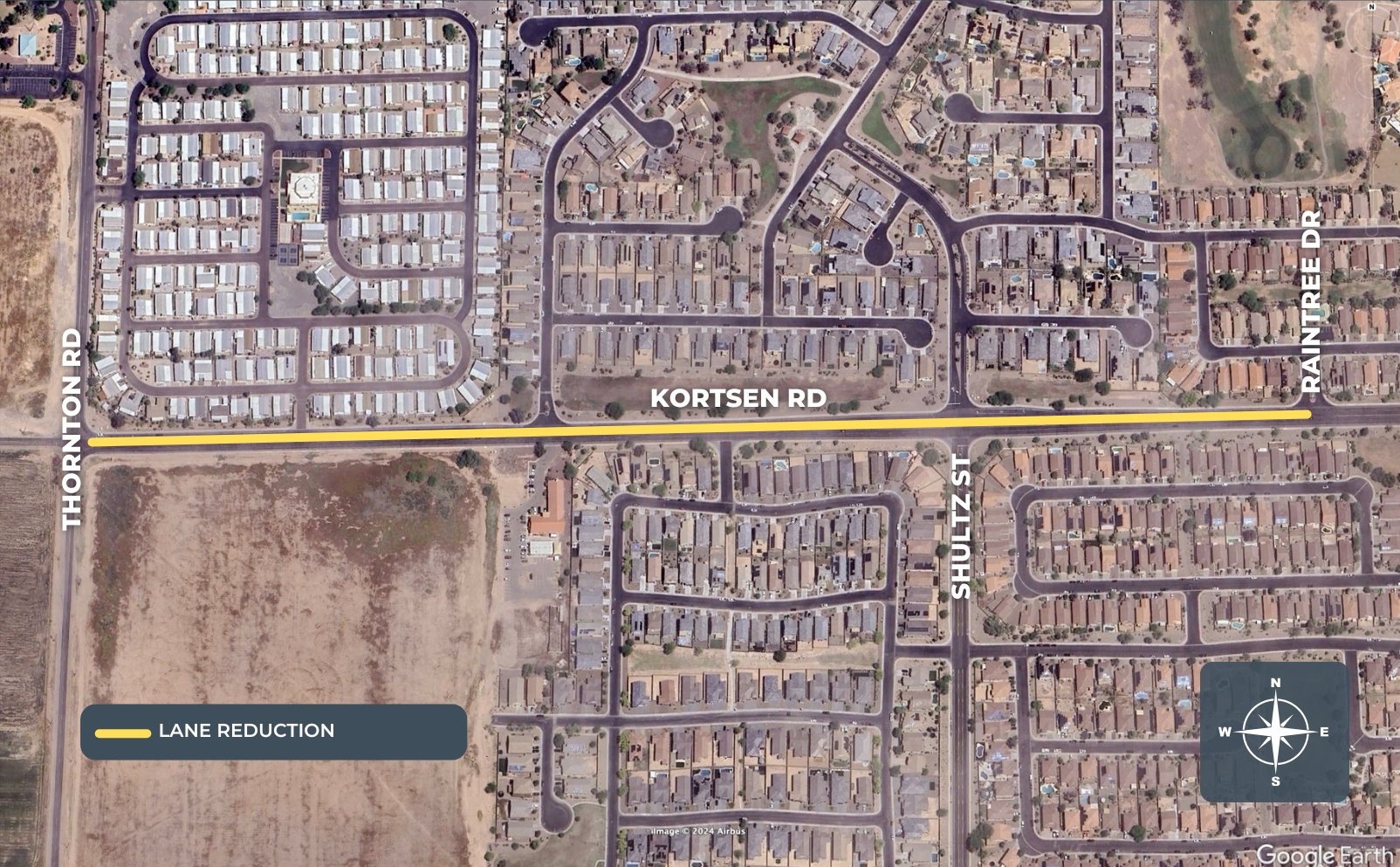 Beginning on Friday, April 12th and lasting through approximately May 10th, Kortsen Road will be reduced from four lanes to two lanes of traffic from Thornton Road to just west of Raintree Drive as part of the Kortsen Road Sewer Relief Project. Contractors will be trenching in the roadway to facilitate pipe installation.