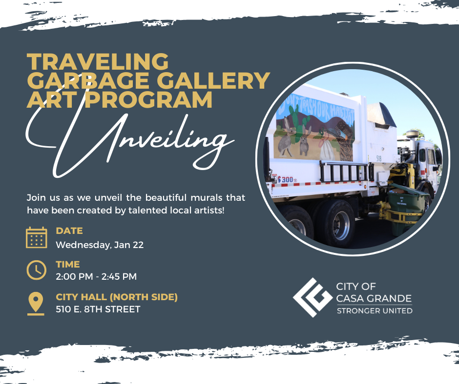For more information about the Traveling Garbage Gallery Art Program, visit the City Website, contact PIO@CasaGrandeAZ.gov, or follow us on Facebook and Instagram at @CityofCG.