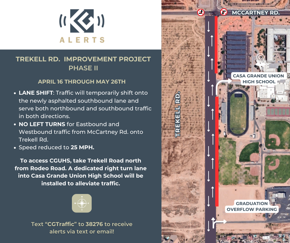 Casa Grande, AZ – Motorists should be aware of impending traffic impacts in the vicinity of Trekell Road and McCartney Road on Tuesday, May 20, between 7:00 p.m. and 9:00 p.m., due to Casa Grande Union High School’s graduation ceremony.
