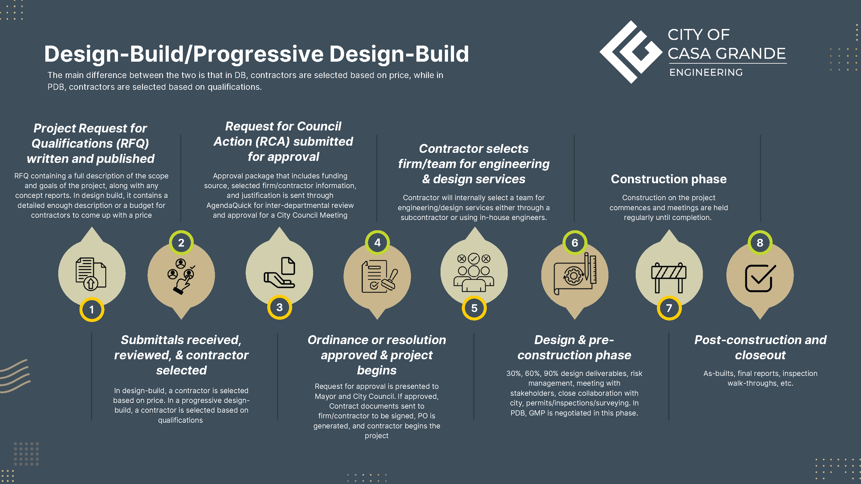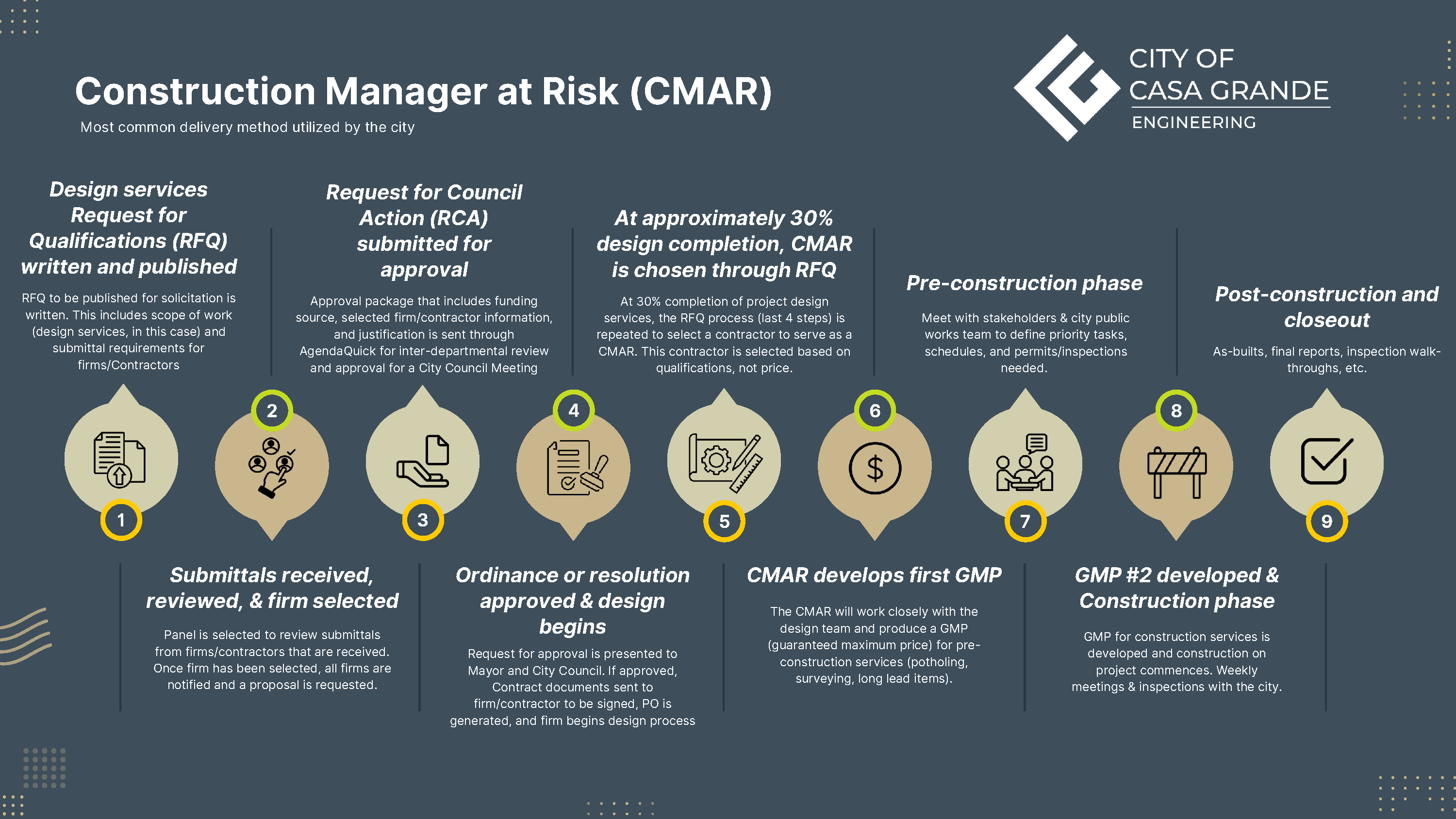 The City of Casa Grande's Public Works Projects follow a structured process to ensure that community needs are met effectively. Projects begin with identifying priorities and funding through the City’s Capital Improvement Plan (CIP). Once approved by City Council, projects move forward using one of several delivery methods, such as Construction Manager at Risk (CMAR), Design-Bid-Build, or Design-Build.