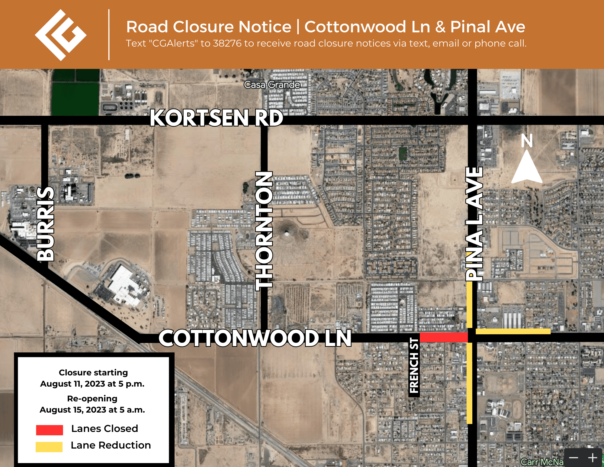 Casa Grande, AZ (August 10, 2023) – Beginning at 5 p.m. on Friday, August 11th and lasting until approximately 5 a.m. on Tuesday, August 15th Cottonwood Lane will be closed to through traffic in both the eastbound and westbound directions from Pinal Avenue to Thornton Road. Lane reductions will also be in place on portions of Pinal Avenue for a waterline installation and pavement repair project. The Arizona Water Company is replacing an existing waterline and installing a fire hydrant at the intersection.